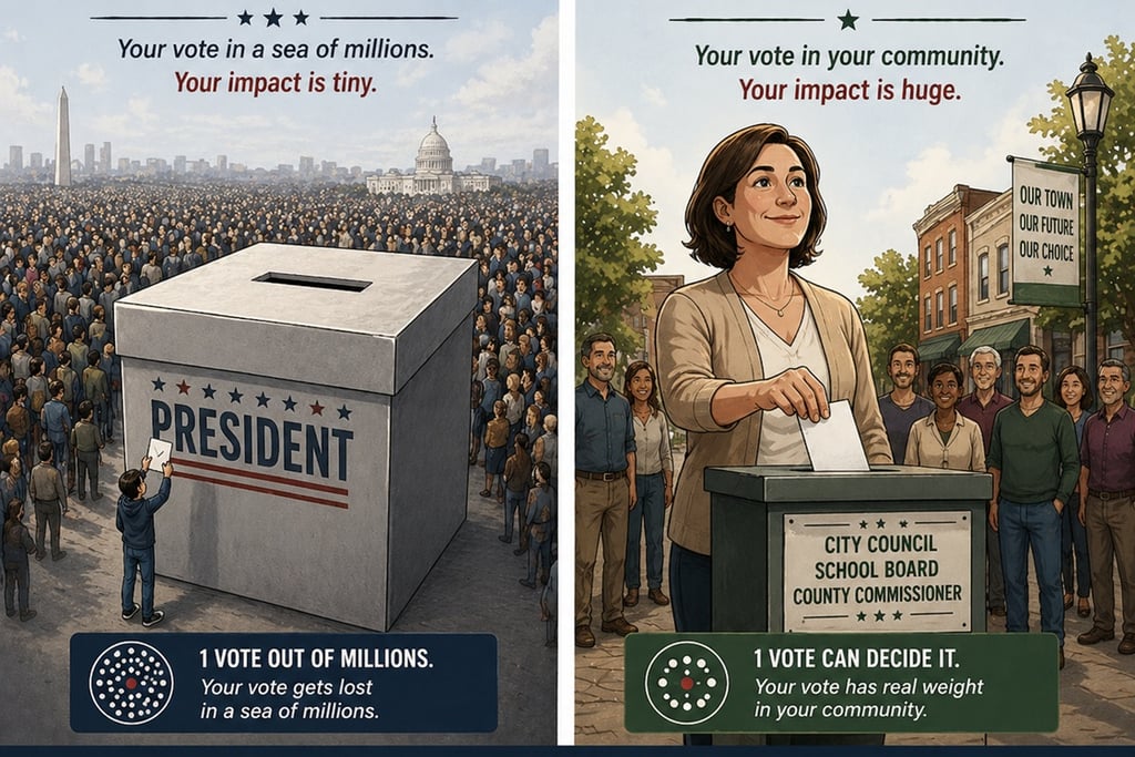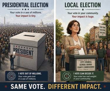 Voting is one of the simplest ways to influence what actually happens in your community—roads get fixed, money gets spent, and leadership gets chosen. In local elections, a surprisingly small group of voters makes those decisions. The difference is simple: some people leave it up to others, and some people take control of the outcome. Even as one teeny tiny little voter, when you vote in a local election YOU ARE TAKING CONTROL and having a direct impact on the outcome.
